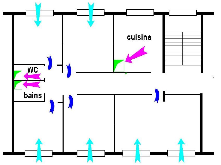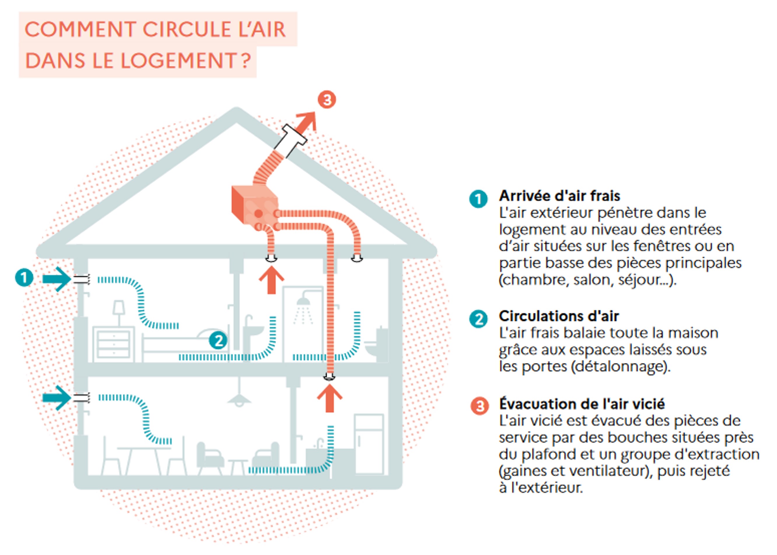 Pour renouveler l’air, le principe est le suivant : l’air neuf entre dans les pièces sèches, les chambres et séjours, puis il est extrait par les pièces humides, cuisine et/ou salle d’eau.