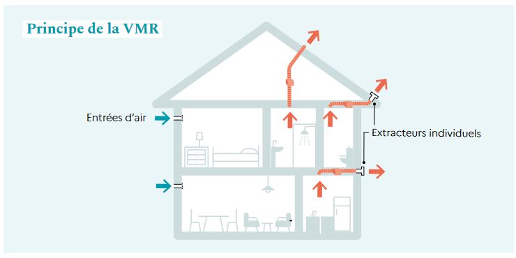 C’est un gain énergétique en hiver, mais une installation complexe qui ne convient pas à toutes les maisons et à tous les modes de vie, car cela demande de l’entretien et de garder les fenêtres fermées. - La ventilation mécanique répartie (VMR) :